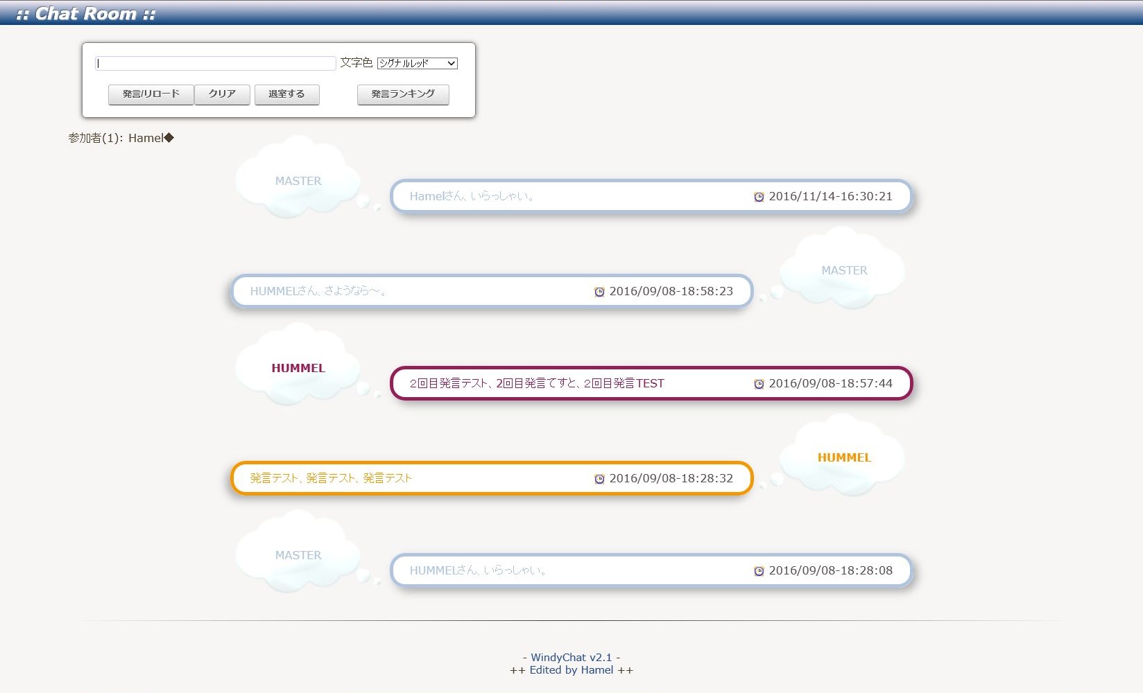 windy.cgi ---------------- チャットプログラム admin.cgi ---------------- 管理プログラム init.cgi ----------------- 設定ファイル check.cgi ---------------- 動作チェック用プログラム cmn/windy.css ------------ スタイルシート cmn/admin.css ------------ スタイルシート(管理モード) cmn/*.png ---------------- アイコンファイル data/log.cgi ------------- データファイル data/mem.cgi ------------- 在室ファイル data/deny.cgi ------------ IP拒否ファイル data/rank.cgi ------------ 発言ランキングファイル tmpl/*.html -------------- テンプレートファイル
